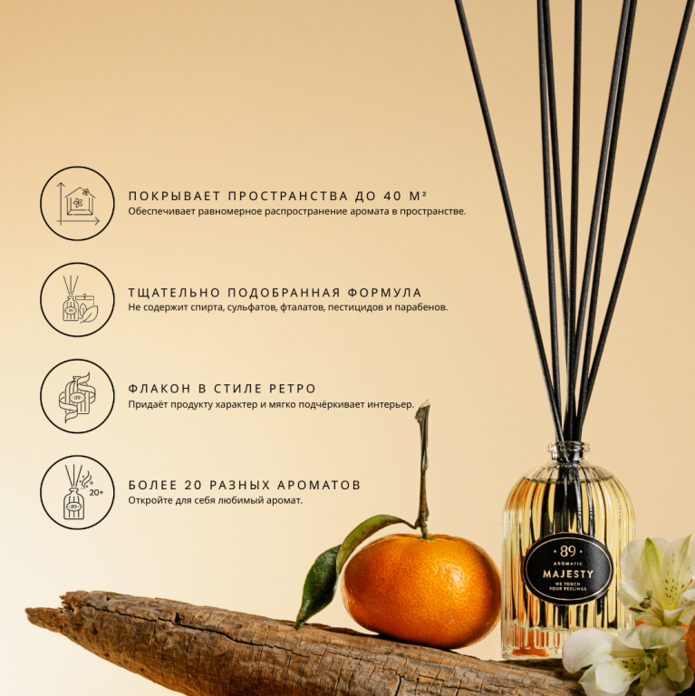 Просто поместите палочки во флакон и позвольте аромату распространяться естественным образом. Регулируйте интенсивность, добавляя, убирая или переворачивая палочки.